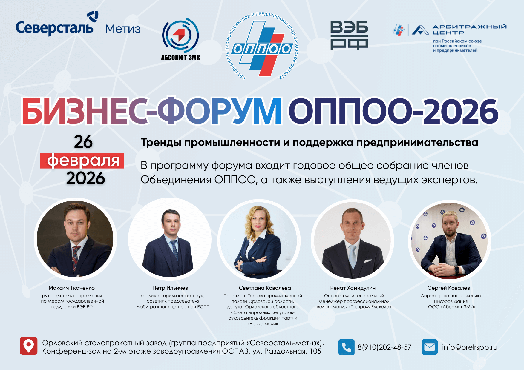 Место проведения: Орловский сталепрокатный завод (группа предприятий «Северсталь‑метиз»), Конференц‑зал на 2‑м этаже заводоуправления ОСПАЗ, ул. Раздольная, 105.